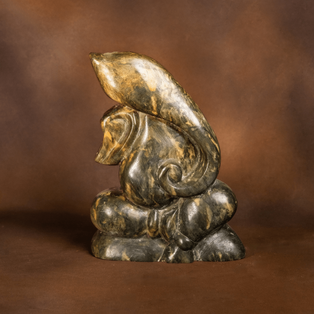 This exquisite abstract sculpture of Lord Ganesha, carved from deep green marble with golden undertones, radiates a silent yet powerful spiritual energy. Representing the remover of obstacles and the harbinger of wisdom, the form transcends traditional features to embrace divine minimalism. The gentle curve of the trunk, the meditative seated posture, and the swirling design around the ear symbolize the eternal flow of wisdom and the cyclical nature of life. The upward-pointing head and broad hood invoke protection, clarity, and inner strength.